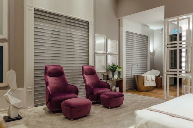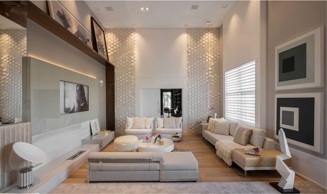 O ambiente de Andrea é Suíte Luxo. A inspiração vem dos hotéis de luxo de Barcelona e Milão, transformados em lar. O mobiliário de formas limpas e contemporâneas dialoga com a marcenaria exclusiva. Placas em cimento branco moldado deixam a parede de 5m de altura ainda mais interessante. Para aquecer, piso em madeira natural com toque acetinado, paginando os 61m².